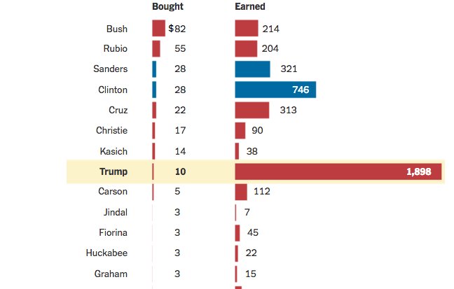 But articles I have read on this subject tend to compare Bernie Sanders' free media with Donald Trump's. Trump has exploited the free media angle better than any candidate before him. Compare Sanders' $321 million worth of free media attention with Trump's nearly $2 billion and it looks (and is) out of whack. But compare him to the front-runner, and as of March 15th, Clinton had twice the free media as Sanders. Still a lot, but Sanders has enjoyed the 3rd most of all the candidates (both parties) and 20 times more than the Democrats' third place candidate, Martin O'Malley.